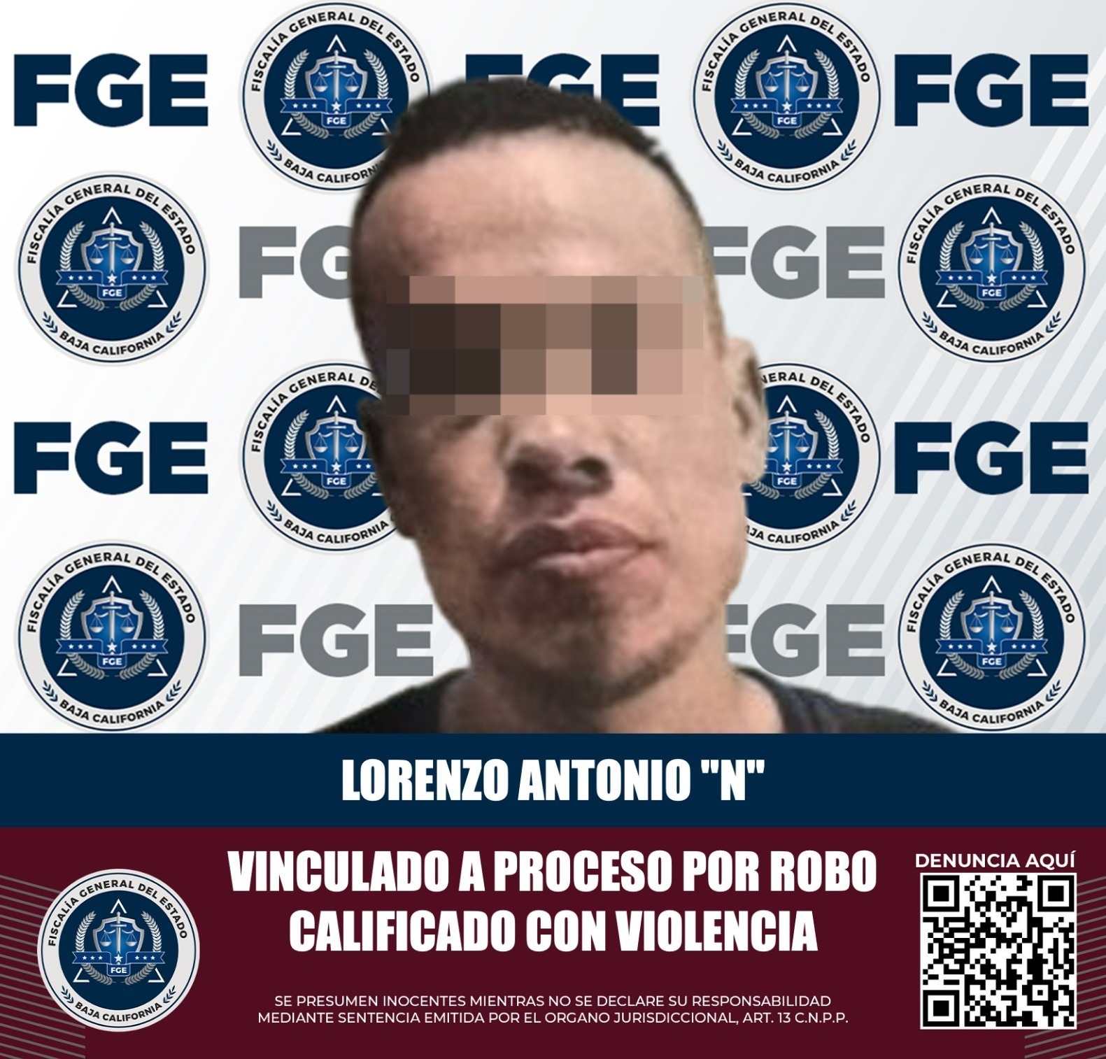 TIJUANA, B.C. La Fiscalía General del Estado logró la vinculación a proceso penal de un imputado por el delito de robo calificado con violencia.