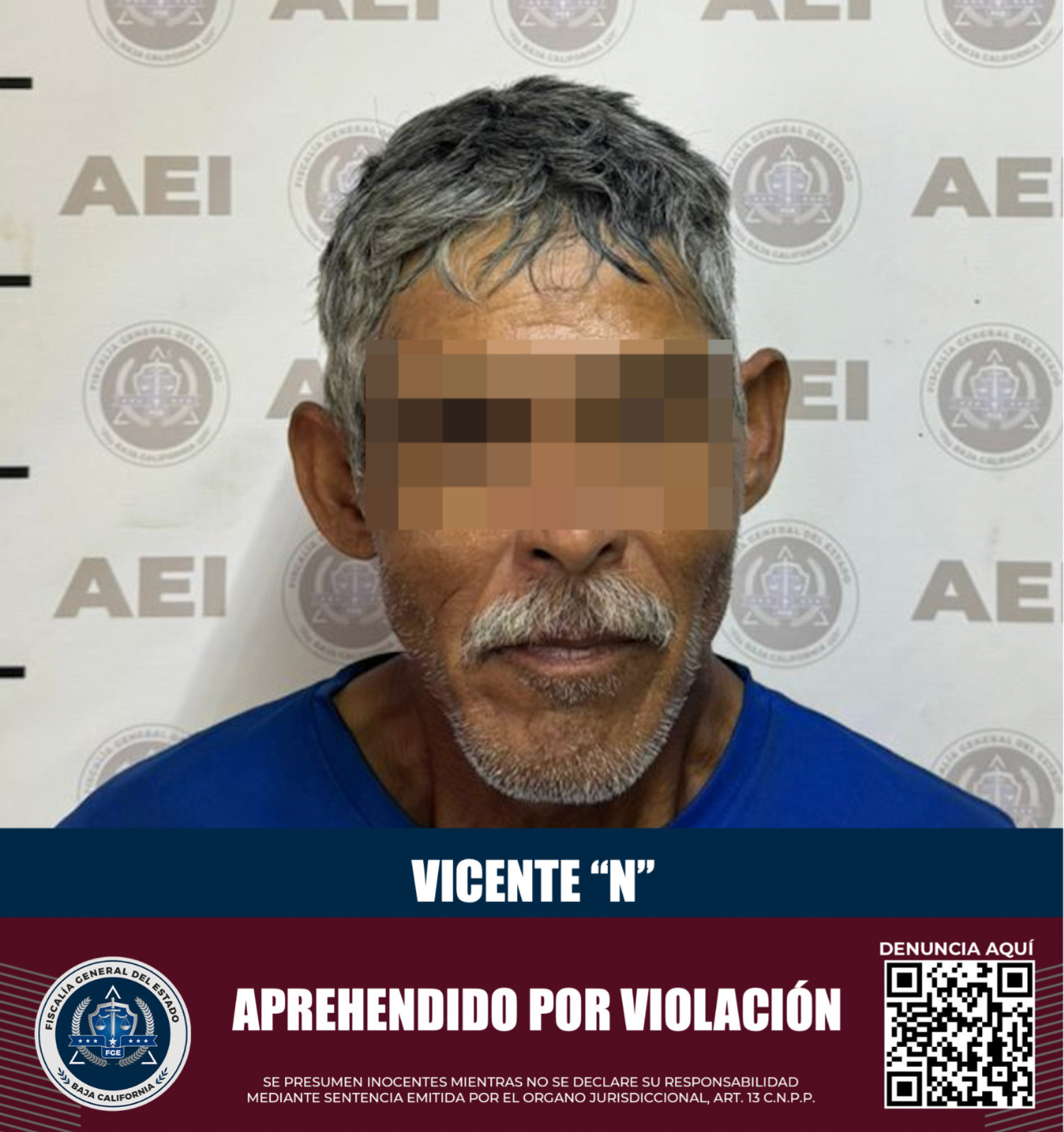 ENSENADA, B.C. Agentes de la Fiscalía General del Estado llevaron a cabo la captura de un individuo identificado como Vicente “N”, de 54 años de edad, quien enfrenta cargos por el delito de violación.