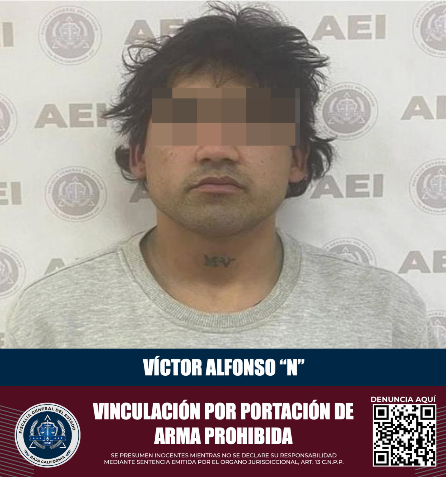 SAN QUINTÍN, B.C. La Fiscalía Regional de San Quintín obtuvo la vinculación a proceso de un sujeto identificado como Víctor Alfonso “N” por el delito de portación de arma prohibida, a quien se le impuso la prisión preventiva como medida cautelar.