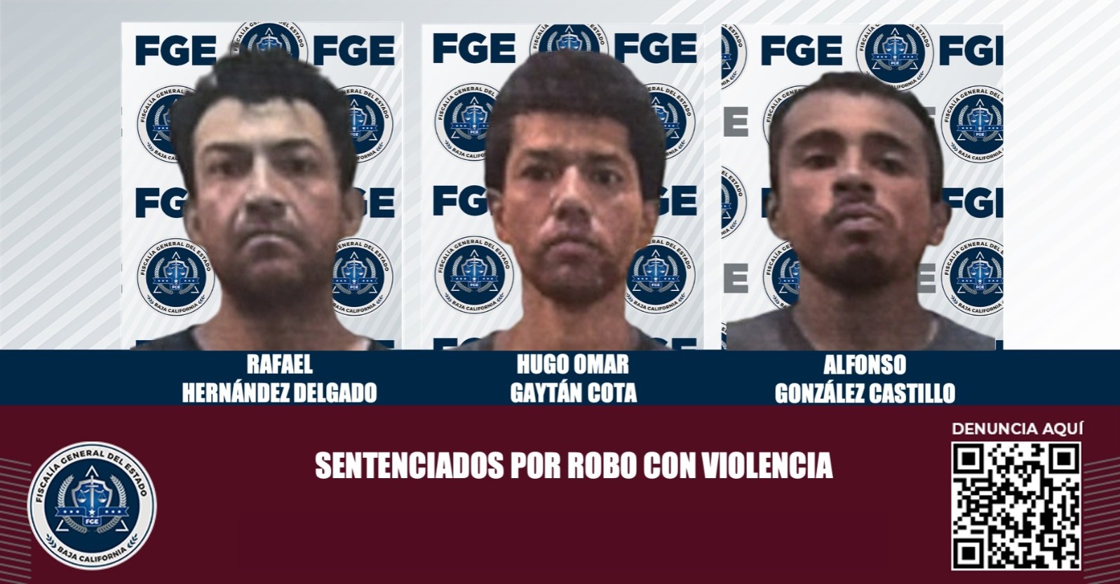 TIJUANA, B.C. La Fiscalía Regional de Tijuana, informa que, se obtuvo la sentencia condenatoria para tres hombres, que tras presentar los datos de prueba, se corroboró su responsabilidad de cometer el delito de robo con violencia en Tijuana.
