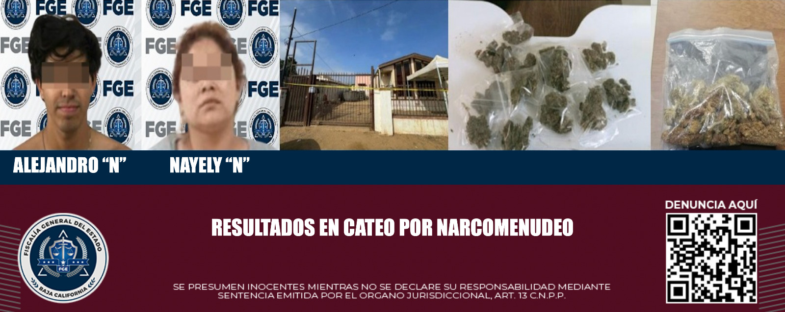 ENSENADA, B.C. La Fiscalía General del Estado ejecutó cateos en las colonias Popular II y Playas de Chapultepec que derivaron en la detención de un hombre y una mujer por presuntos delitos relacionados con el narcomenudeo.