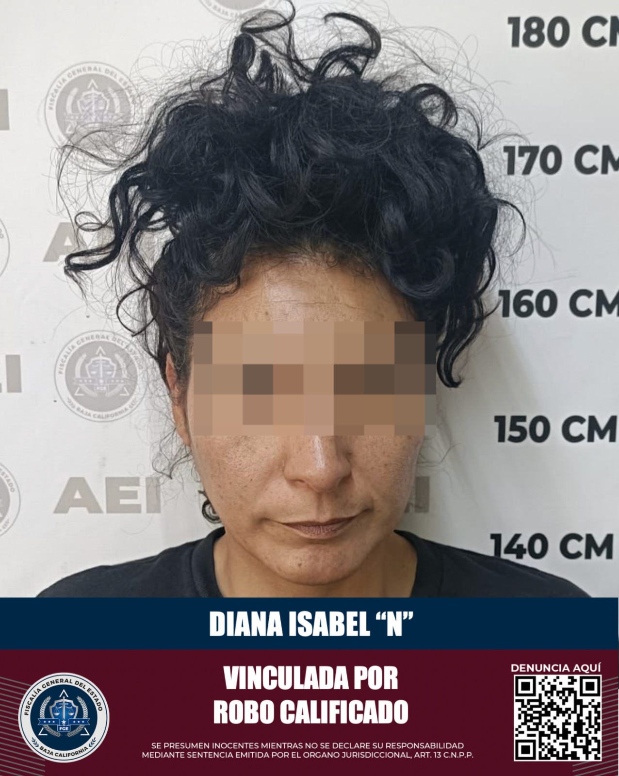 ENSENADA, B.C. La Fiscalía Regional de Ensenada obtuvo la vinculación a proceso de Diana Isabel “N”, quien fue detenida por medio de una orden de aprehensión por el delito de robo calificado, tras su presunta implicación en un incidente de robo de cableado de fibra óptica.