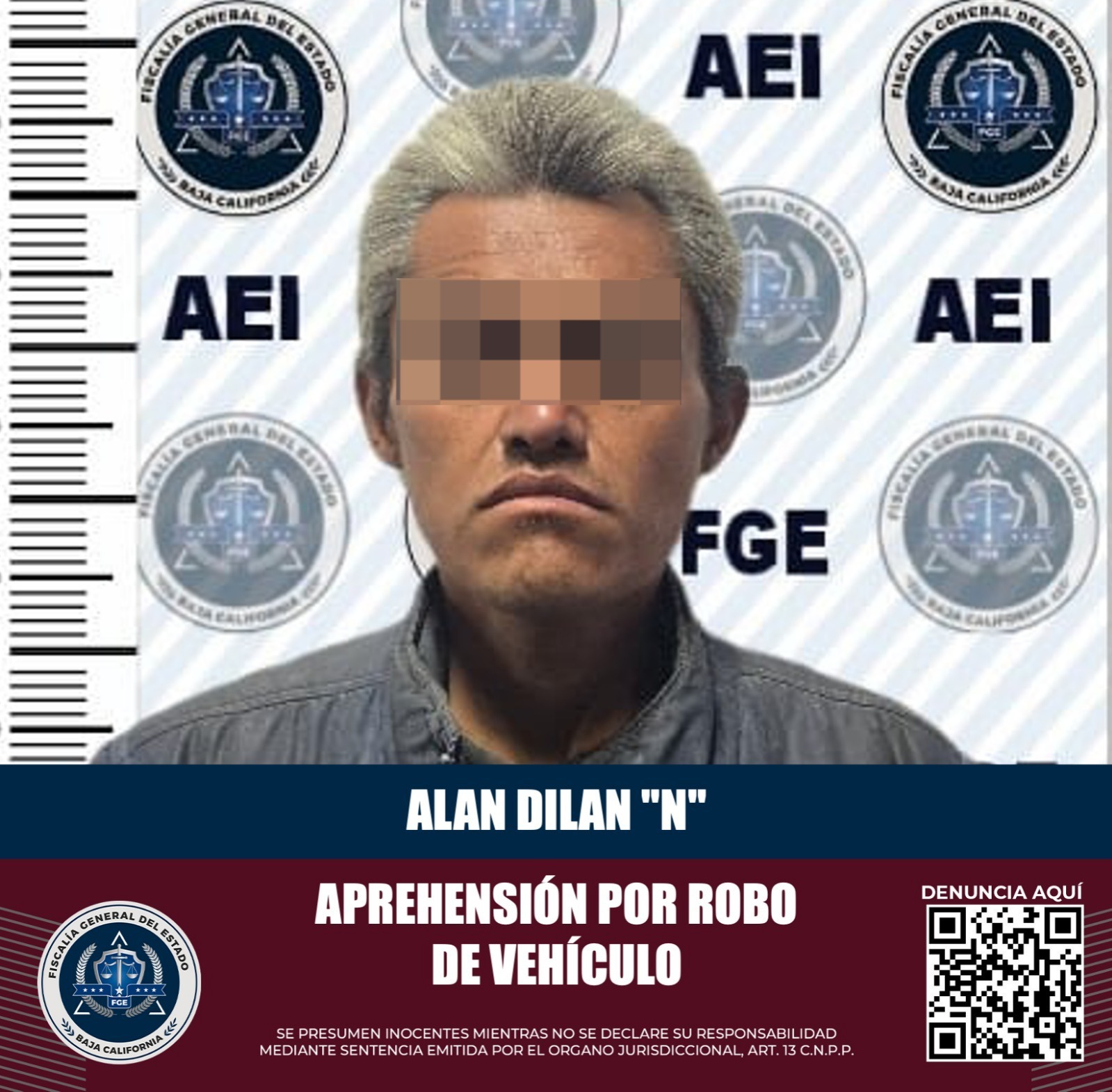 TIJUANA, B.C. La Fiscalía Regional de Tijuana, informa que, la Agencia Estatal de Investigación logró la captura de un hombre, a través de una orden de aprehensión por el delito de robo de vehículo de motor en su modalidad de uso de vehículo de motor robado.