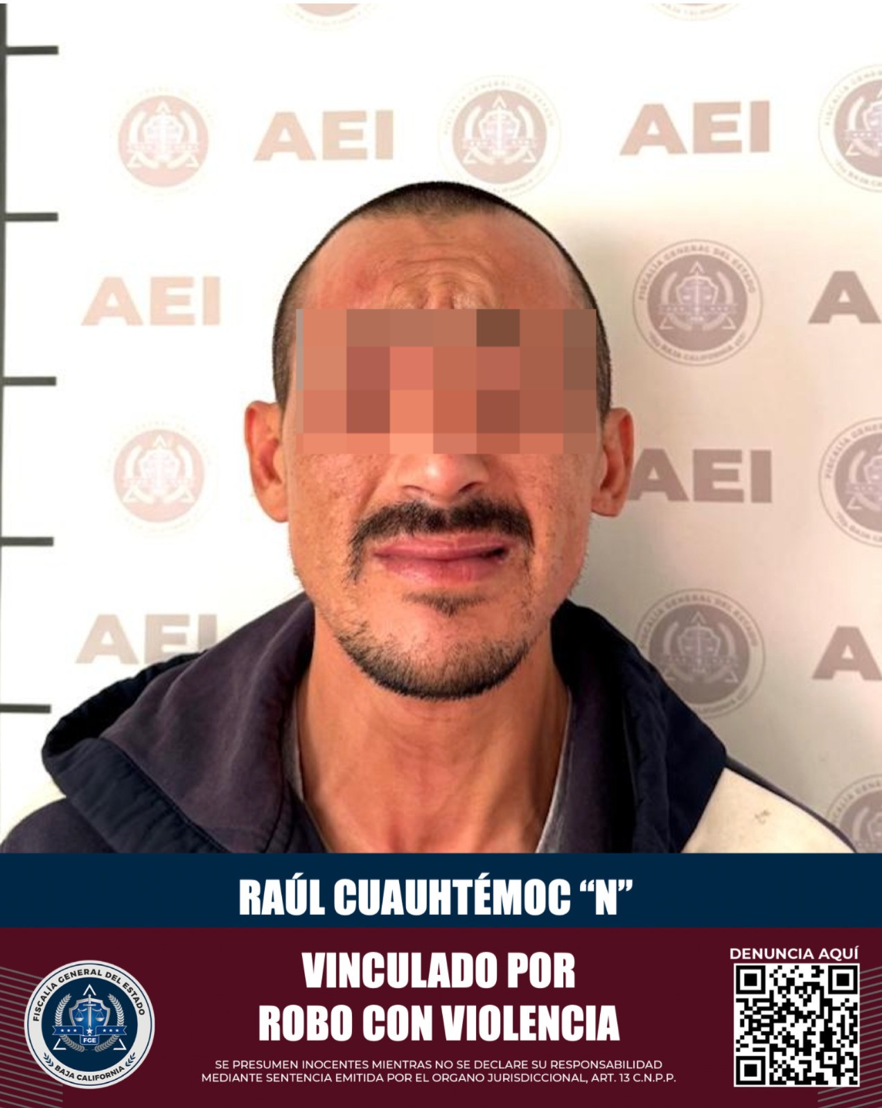ENSENADA, B.C. LA Fiscalía Regional de Ensenada logró la vinculación a proceso y medida cautelar de prisión preventiva contra Raúl Cuauhtémoc “N”, de 30 años de edad, por su presunta implicación en un robo con violencia cometido en agravio de un transeúnte.