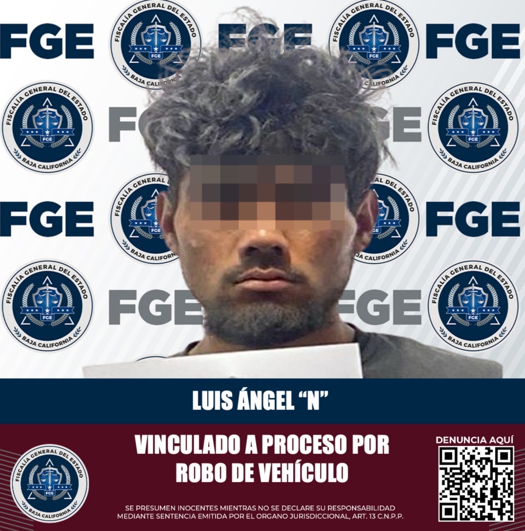 TIJUANA, B.C. La Fiscalía General del Estado, a través de la Fiscalía Regional de Tijuana, logró la vinculación a proceso Luis Ángel "N", por el delito de robo equiparado de vehículo de motor en su modalidad de poseer.
