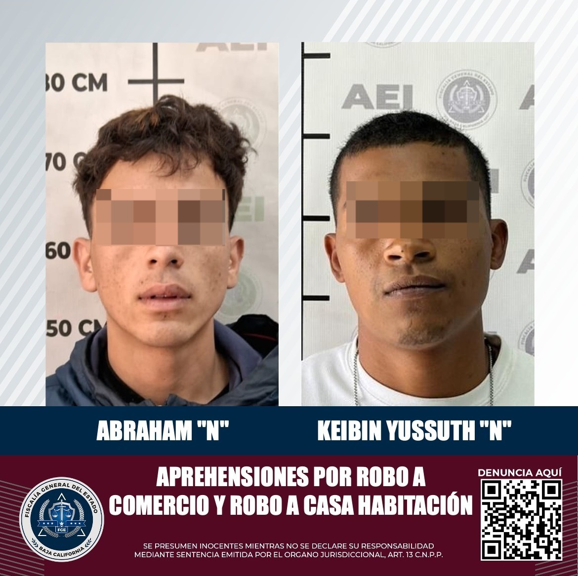 PLAYAS DE ROSARITO, B.C. La Fiscalía General del Estado, a través de la Agencia Estatal de Investigación (AEI), logró la captura de dos imputados por los delitos de robo a comercio con violencia y robo a casa habitación, ya que contaban con mandamientos judiciales en su contra.