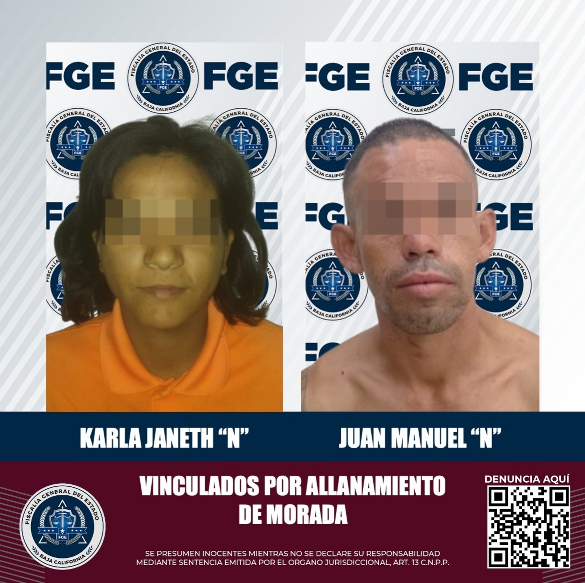 MEXICALI, B.C. La Fiscalía Regional de Mexicali, a través de las Unidades de Investigación con Detenidos Oriente y Poniente, obtuvo con base en los elementos de prueba la vinculación a proceso de una mujer y un hombre, imputados por el delito de allanamiento.