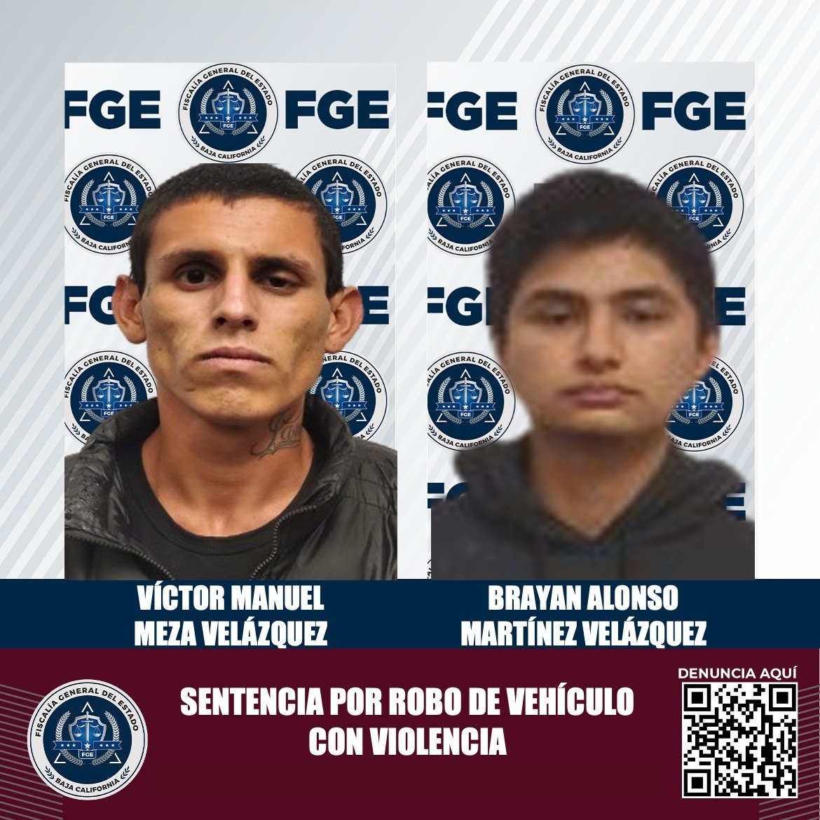 PLAYAS DE ROSARITO, B.C. La Fiscalía General del Estado, a través de la Fiscalía Regional de Playas de Rosarito, logró una sentencia de cinco años y cuatro meses de prisión para Brayan Alonso Martínez Velázquez y Víctor Manuel Meza Velázquez, por su responsabilidad en el delito de robo de vehículo de motor ejecutado con violencia moral equiparada.