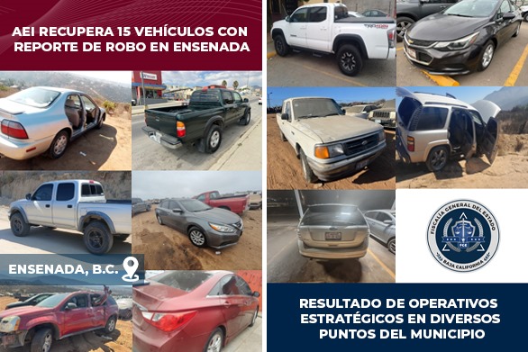 ENSENADA, B.C. La Fiscalía General del Estado (FGE), a través de la Agencia Estatal de Investigación (AEI), ha intensificado acciones en las investigaciones y el combate al robo de vehículos, logrando el aseguramiento de 15 automóviles robados en el municipio de Ensenada. Estas acciones forman parte de las directrices de la Fiscal General, Ma. Elena Andrade Ramírez, para reforzar las labores en la inhibición y combate de delitos en la región.