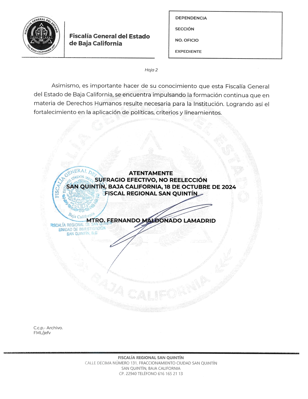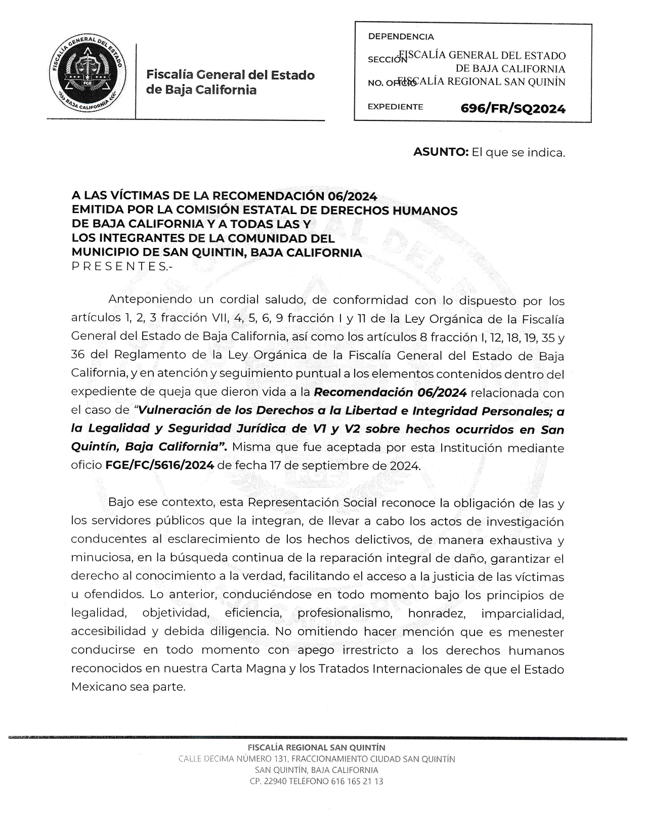 Anteponiendo un cordial saludo, de conformidad con lo dispuesto por los artículos 1, 2, 3 fracción VII, 4, 5, 6, 9 fracción I y 11 de la Ley Orgánica de la Fiscalía General del Estado de Baja California, así como los artículos 8 fracción I, 12, 18, 19, 35 y 36 del Reglamento de la Ley Orgánica de la Fiscalía General del Estado de Baja California, y en atención y seguimiento puntual a los elementos contenidos dentro del expediente de queja que dieron vida a la Recomendación 06/2024 relacionada con el caso de “Vulneración de los Derechos a la Libertad e Integridad Personales; a la Legalidad y Seguridad Jurídica de V1 y V2 sobre hechos ocurridos en San Quintín, Baja California”. Misma que fue aceptada por esta Institución mediante oficio FGE/FC/5616/2024 de fecha 17 de septiembre de 2024.