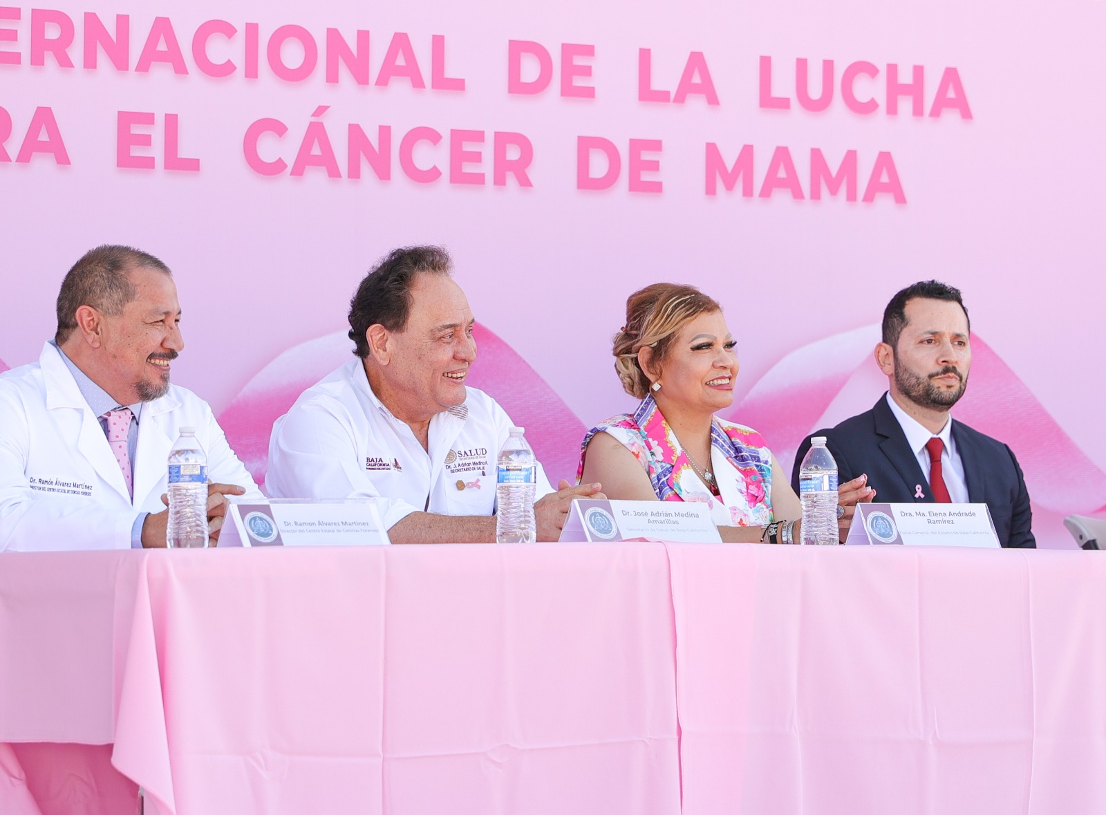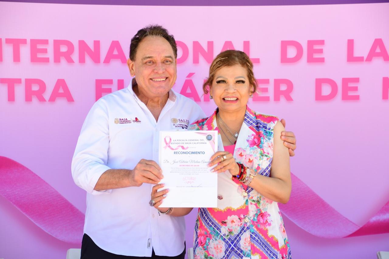 En su participación, el Secretario de Salud, José Adrián Medina Amarillas, comentó que la prioridad es el cuidado de la salud e invitó a las mujeres a practicarse una mastografía, señalando que la detección oportuna del cáncer de mama aumenta las probabilidades de un resultado favorable.