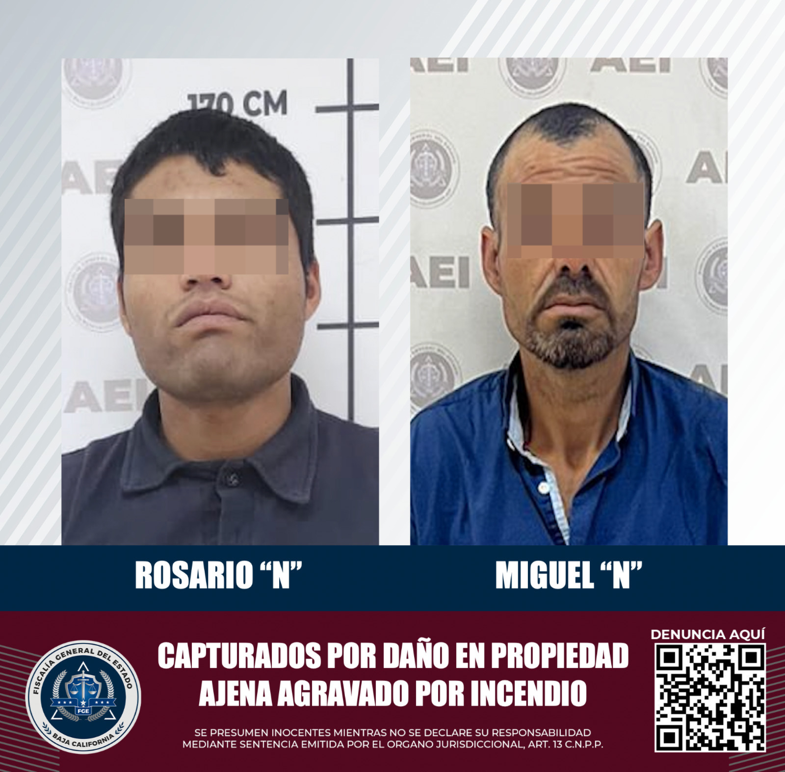 El 21 de octubre de 2024, Agentes Estatales de Investigación cumplimentaron las órdenes de aprehensión contra Miguel “N” y Rosario “N”, por el delito de daño en propiedad ajena agravado por incendio.