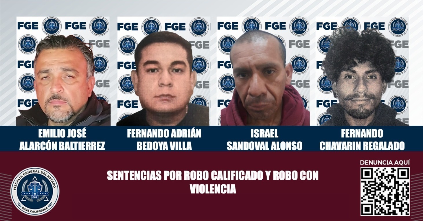 TIJUANA BAJA CALIFORNIA. - La Fiscalía General del Estado de Baja California, a través de la Fiscalía Regional de Tijuana, obtuvo sentencias condenatorias mediante procedimientos abreviados en diversos casos relacionados con robo calificado y robo con violencia, resultado de investigaciones detalladas y procesos judiciales que aseguran la impartición de justicia en la entidad.