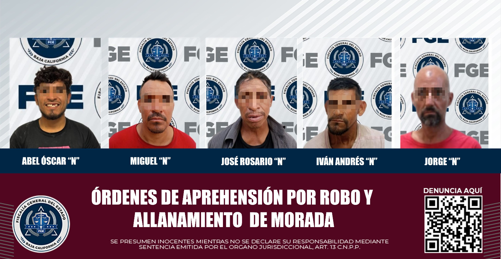 MEXICALI, B.C. Elementos de la Fiscalía Regional de Mexicali, a través de diversas acciones efectuadas, lograron la aprehensión de cinco prófugos de la justicia por relacionados en los delitos de robo en sus diferentes modalidades y allanamiento de morada.