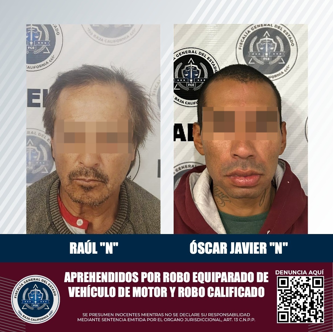 TIJUANA, BAJA CALIFORNIA. - La Fiscalía General del Estado, a través de la Agencia Estatal de Investigación en la Zona Tijuana, cumplimentó órdenes de aprehensión en contra de dos individuos acusados de diversos delitos de robo, tras investigaciones realizadas en gabinete y en campo.