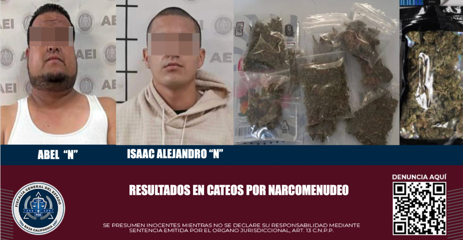 ENSENADA, BAJA CALIFORNIA. - La Fiscalía General del Estado ejecutó dos órdenes de cateo que tuvieron como resultado el aseguramiento de drogas y la detención de dos sujetos por delitos contra la salud.