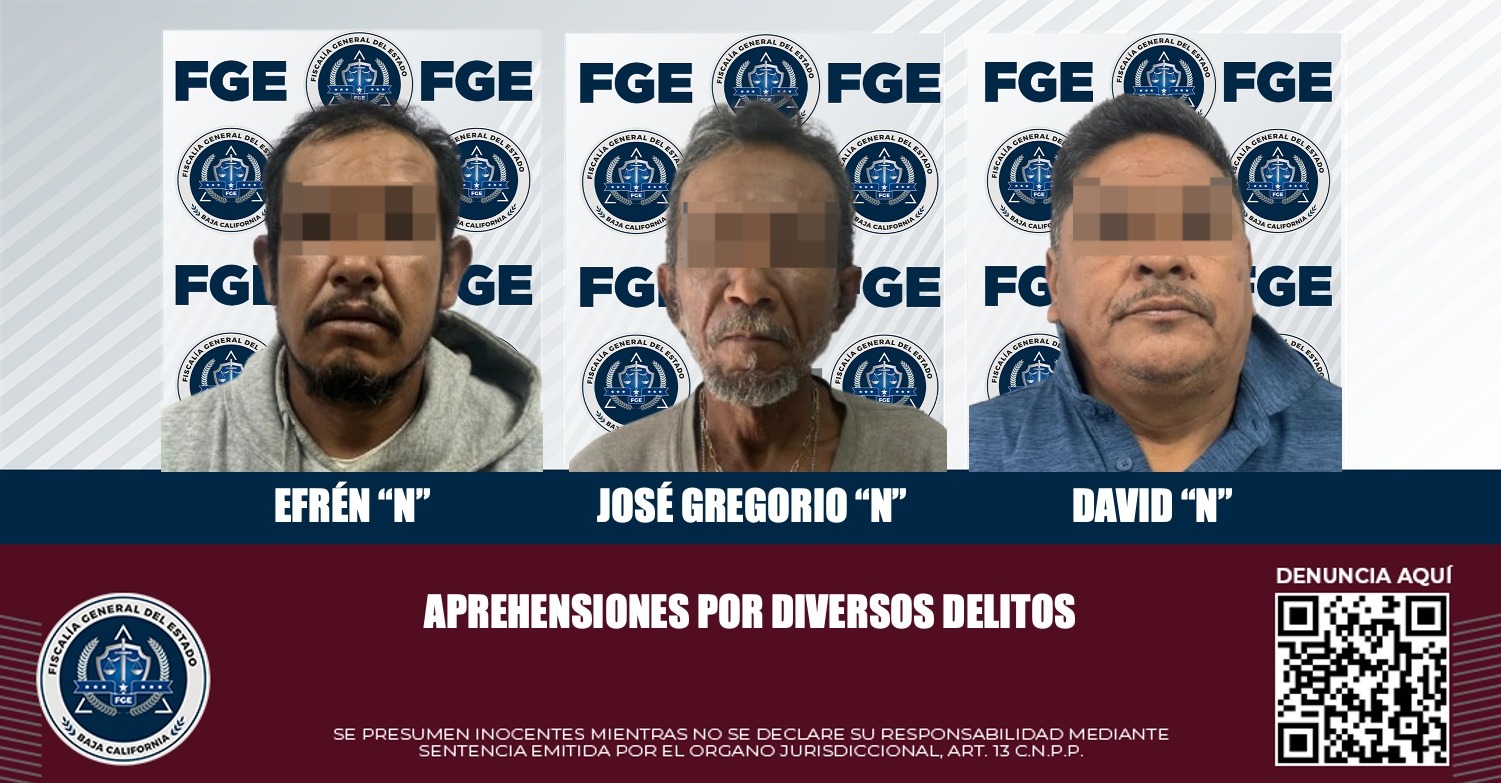 PLAYAS DE ROSARITO, BAJA CALIFORNIA. - Tras labor desplegada por agentes estatales de investigación de la Fiscalía General del Estado, se logró detener a tres hombres, a quienes se les cumplimentó orden de aprehensión, en razón que, en asuntos por separado, están implicados en delitos de robo calificado a lugar cerrado, narcomenudeo, lesiones dolosas y violencia familiar equiparada.
