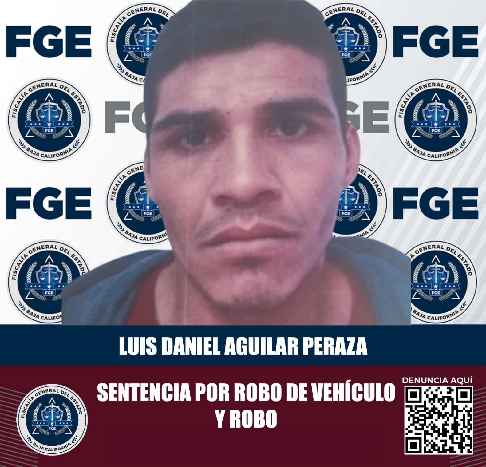 PLAYAS DE ROSARITO, BAJA CALIFORNIA. - La Fiscalía Regional de Playas de Rosarito informa que Luis Daniel Aguilar Peraza fue sentenciado a 6 años, 6 meses y 1 día de prisión, tras ser encontrado plenamente responsable del delito de robo de vehículo de motor ejecutado con violencia moral equiparada y robo.