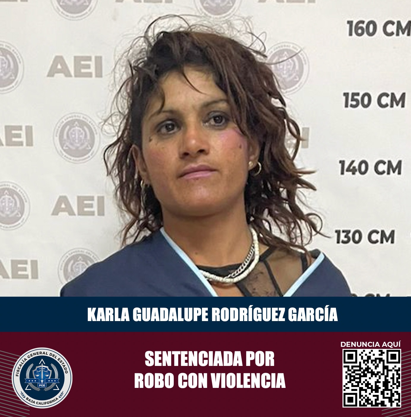 SAN QUINTÍN, BAJA CALIFORNIA. - La Fiscalía Regional de San Quintín obtuvo una sentencia condenatoria contra Karla Guadalupe Rodríguez García, acusada de robo con violencia en un establecimiento comercial el 19 de febrero del presente año.