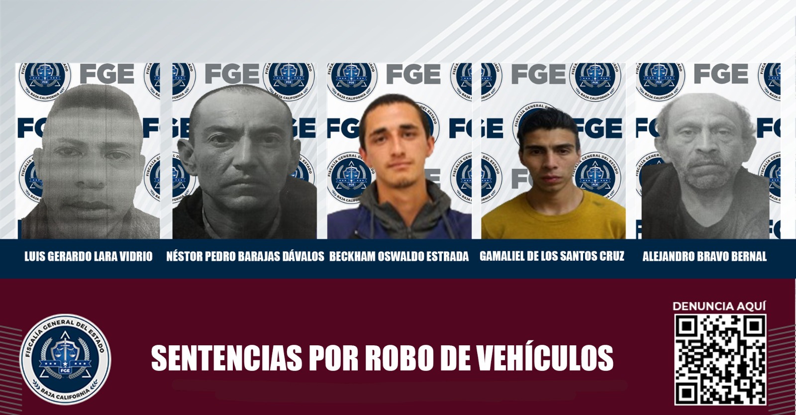 TIJUANA, BAJA CALIFORNIA. - La Fiscalía Regional de Tijuana informa de la obtención de cinco sentencias condenatorias, en contra de responsables del delito de robo de vehículo por posesión, sustracción o uso, ya que aceptaron su responsabilidad en procedimientos abreviados.