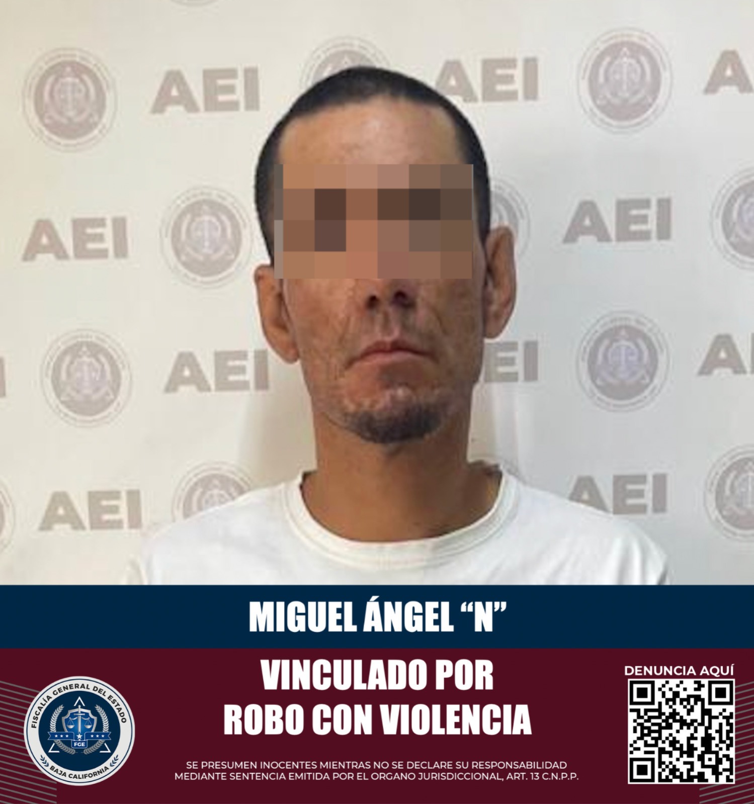 ENSENADA, BAJA CALIFORNIA. - La Fiscalía Regional de Ensenada logró auto de vinculación a proceso contra Miguel Ángel “N”, quien fue detenido por medio de una orden de aprehensión por robo con violencia cometido en un establecimiento comercial.