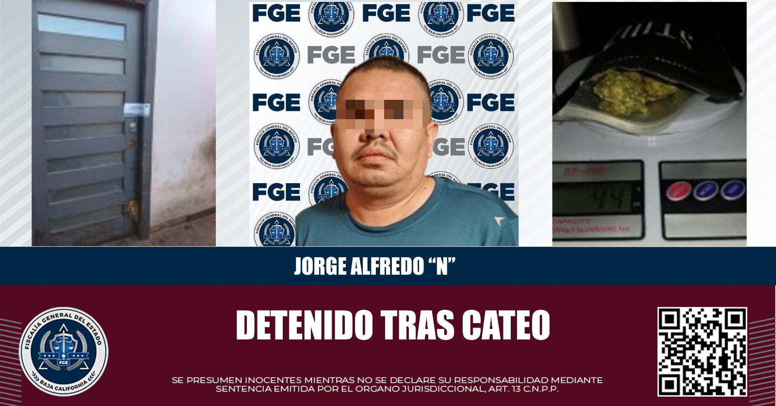 MEXICALI, BAJA CALIFORNIA. - Elementos de la Fiscalía General del Estado (FGE), ejecutaron un cateo logrando el aseguramiento de Jorge Alfredo "N", presunto narcomenudista y el decomiso de droga.