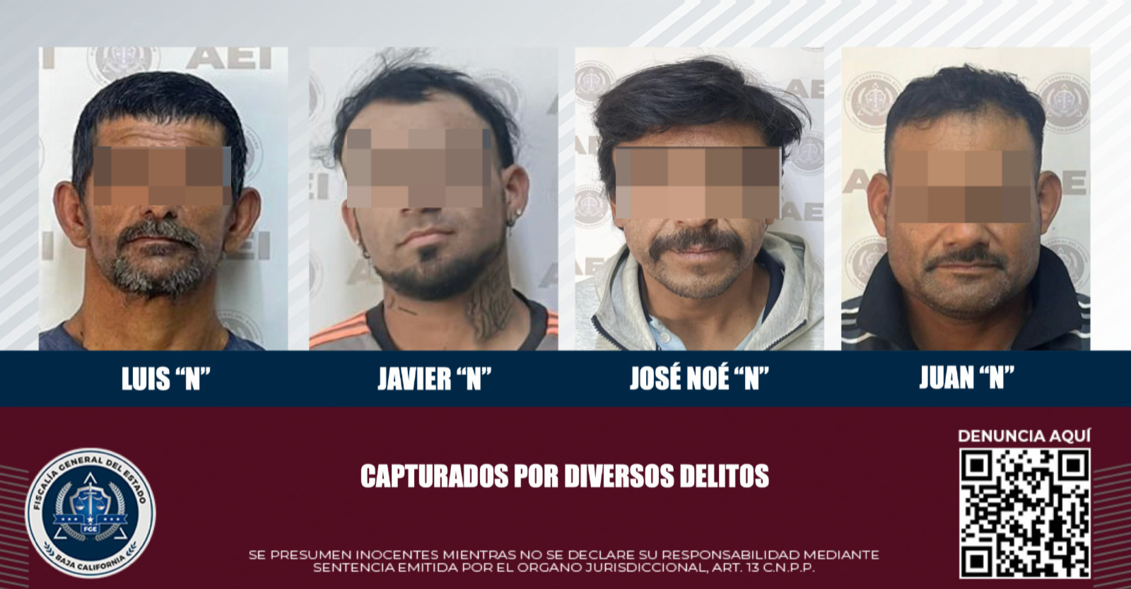 ENSENADA, BAJA CALIFORNIA. - Elementos de la Agencia Estatal de Investigación de la Fiscalía General del Estado dieron cumplimiento a órdenes de aprehensión contra individuos implicados en delitos de narcomenudeo, violencia familiar, robo e incumplimiento de las obligaciones de asistencia familiar.
