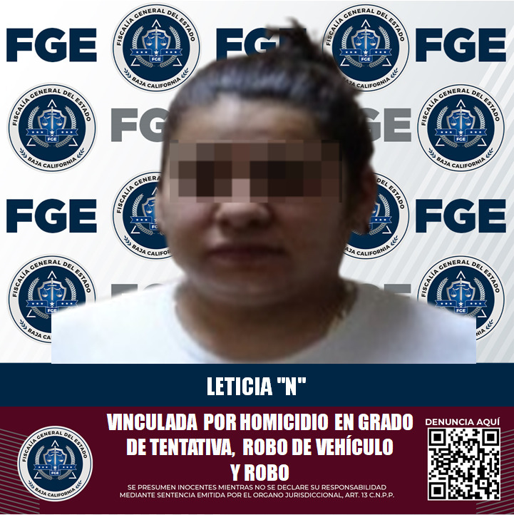 MEXICALI, BAJA CALIFORNIA. - Por su presunta participación en los delitos de homicidio en grado de tentativa, robo de vehículo y robo, una mujer fue vinculada a proceso con base a los elementos de prueba presentados por la Fiscalía Regional de Mexicali.