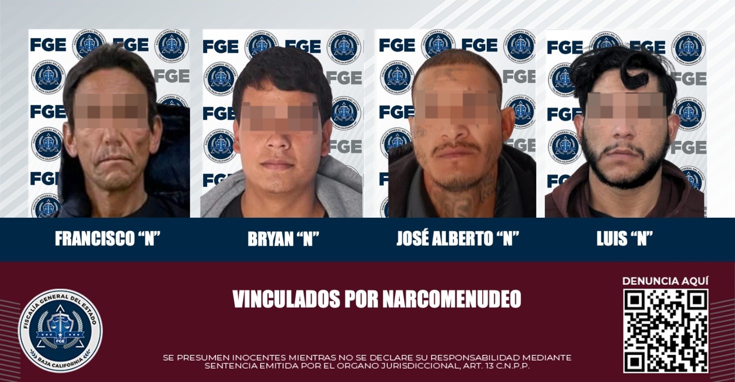 ENSENADA, BAJA CALIFORNIA. - Cuatro sujetos quedaron vinculados a proceso y permanecerán en prisión preventiva, tras la presentación de cargos penales por narcomenudeo por parte del agente del Ministerio Público, informó la Fiscalía General del Estado.
