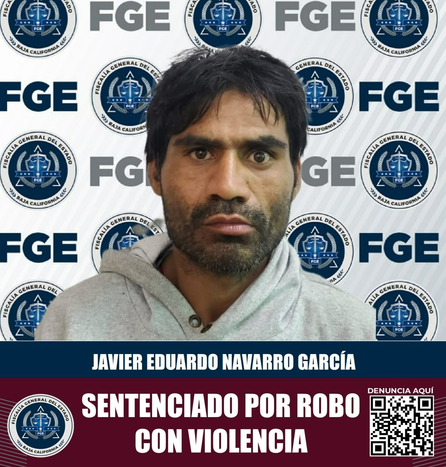 MEXICALI, BAJA CALIFORNIA. - La Fiscalía Regional de Mexicali logró fallo condenatorio en contra de Javier Eduardo Navarro García, por el delito de robo calificado con violencia en establecimiento comercial abierto al público.