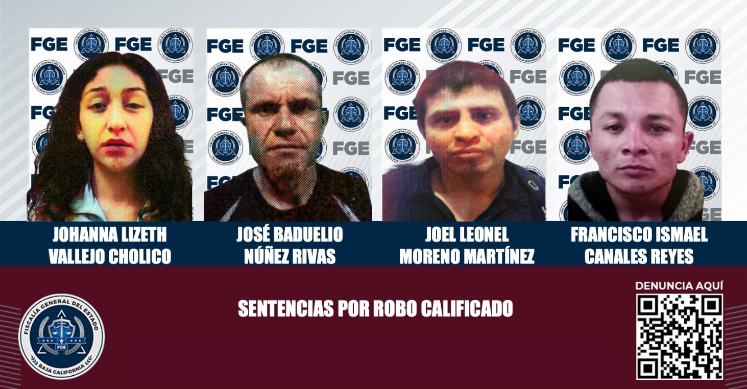 TIJUANA, BAJA CALIFORNIA. - Gracias a la labor de investigación y presentación de datos de prueba por parte del Ministerio Público, la Fiscalía General del Estado, obtuvo cuatro sentencias condenatorias a igual número de personas, por el delito de robo calificado.