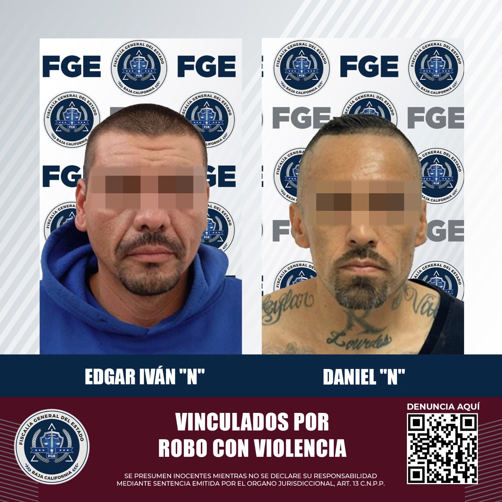 MEXICALI, BAJA CALIFORNIA. - En audiencias celebradas por separado, la Fiscalía Regional de Mexicali logró la vinculación a proceso de dos hombres por los delitos de robo calificado cometido en establecimiento comercial abierto al público con violencia y robo calificado cometido por dos o más personas, respectivamente.