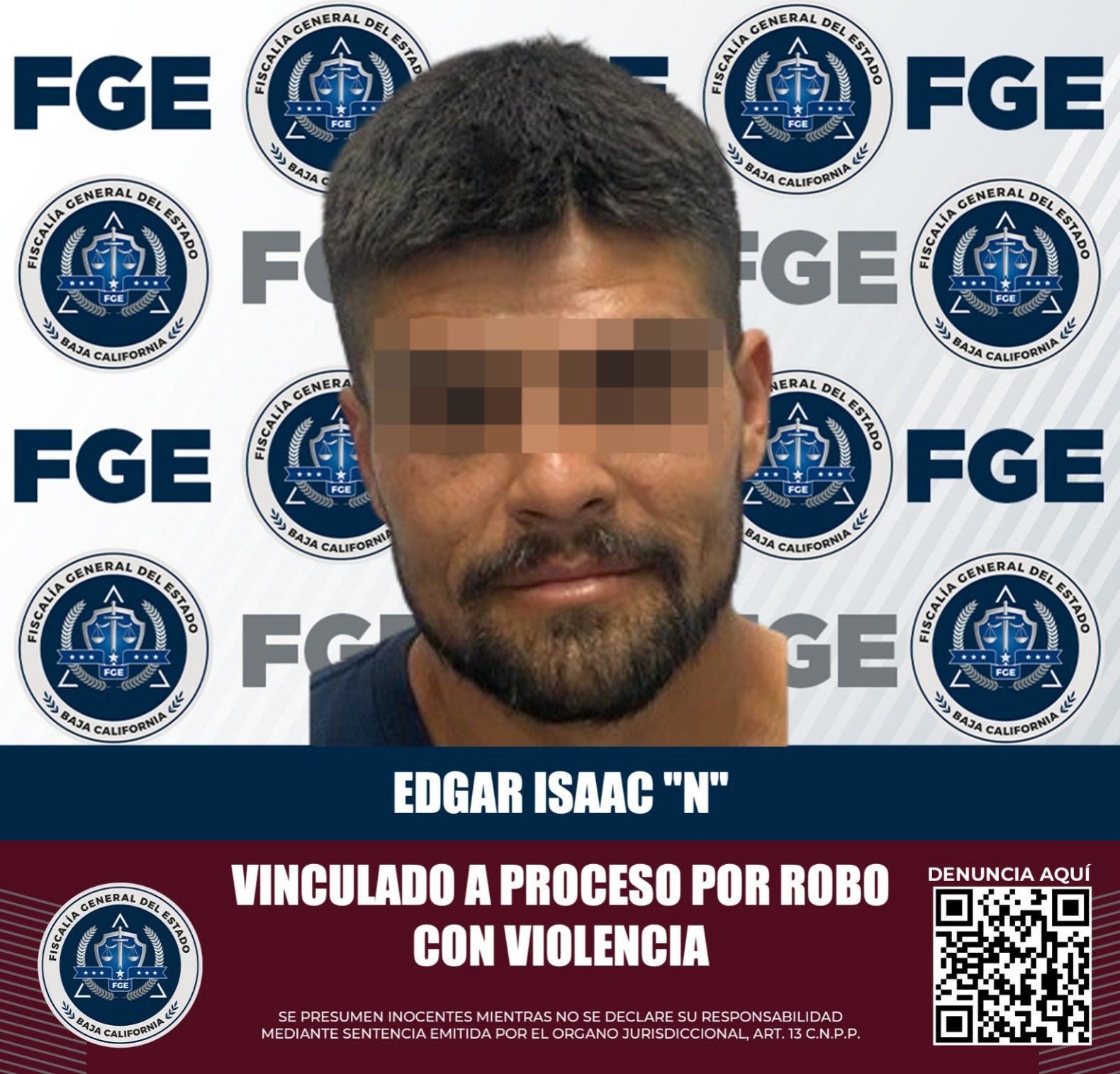 TIJUANA, BAJA CALIFORNIA. - La Fiscalía Regional de Tijuana logró la vinculación a proceso de Edgar Isaac “N” por su presunta responsabilidad en los delitos de robo y robo de vehículo, ambos ejecutados con violencia ocurridos el pasado 11 de octubre de 2024.