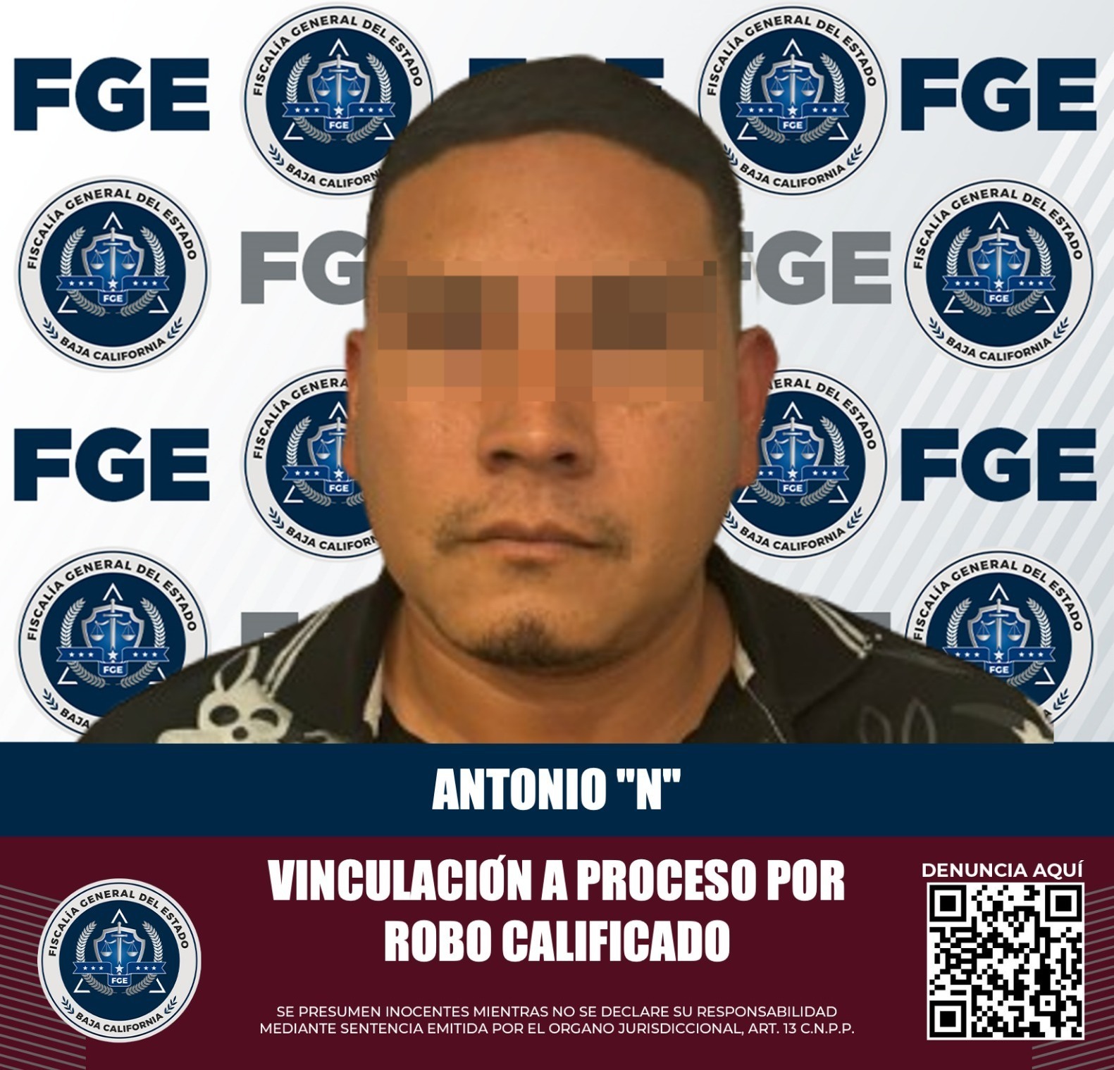TIJUANA, BAJA CALIFORNIA. - La Fiscalía Regional de Tijuana, tras diversas investigaciones y acciones de campo, logró que Antonio “N”, fuera vinculado a proceso por el delito de robo calificado a comercio abierto al público ejecutado con violencia y con arma, en dos hechos ocurridos en la ciudad.