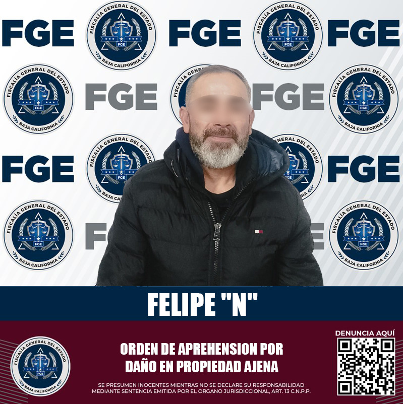 TIJUANA, BAJA CALIFORNIA. - La Agencia Estatal de Investigación, Zona Tijuana, llevó a cabo el cumplimiento de una orden de aprehensión en contra de Felipe “N”, acusado del delito de daño en propiedad ajena. La acción fue realizada el 18 de noviembre de 2024, en la calle de la Pizarra, ubicada en la sección Costa Hermosa de Playas de Tijuana.