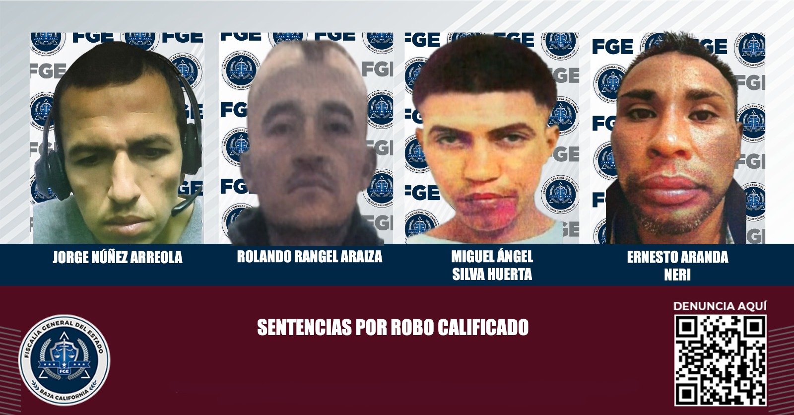 TIJUANA, BAJA CALIFORNIA. - La Fiscalía Regional de Tijuana, logró obtener cuatro sentencias condenatorias por robo calificado, a igual número de imputados, a quienes con argumentos y datos de prueba presentados, se les comprobó su responsabilidad en el ilícito.