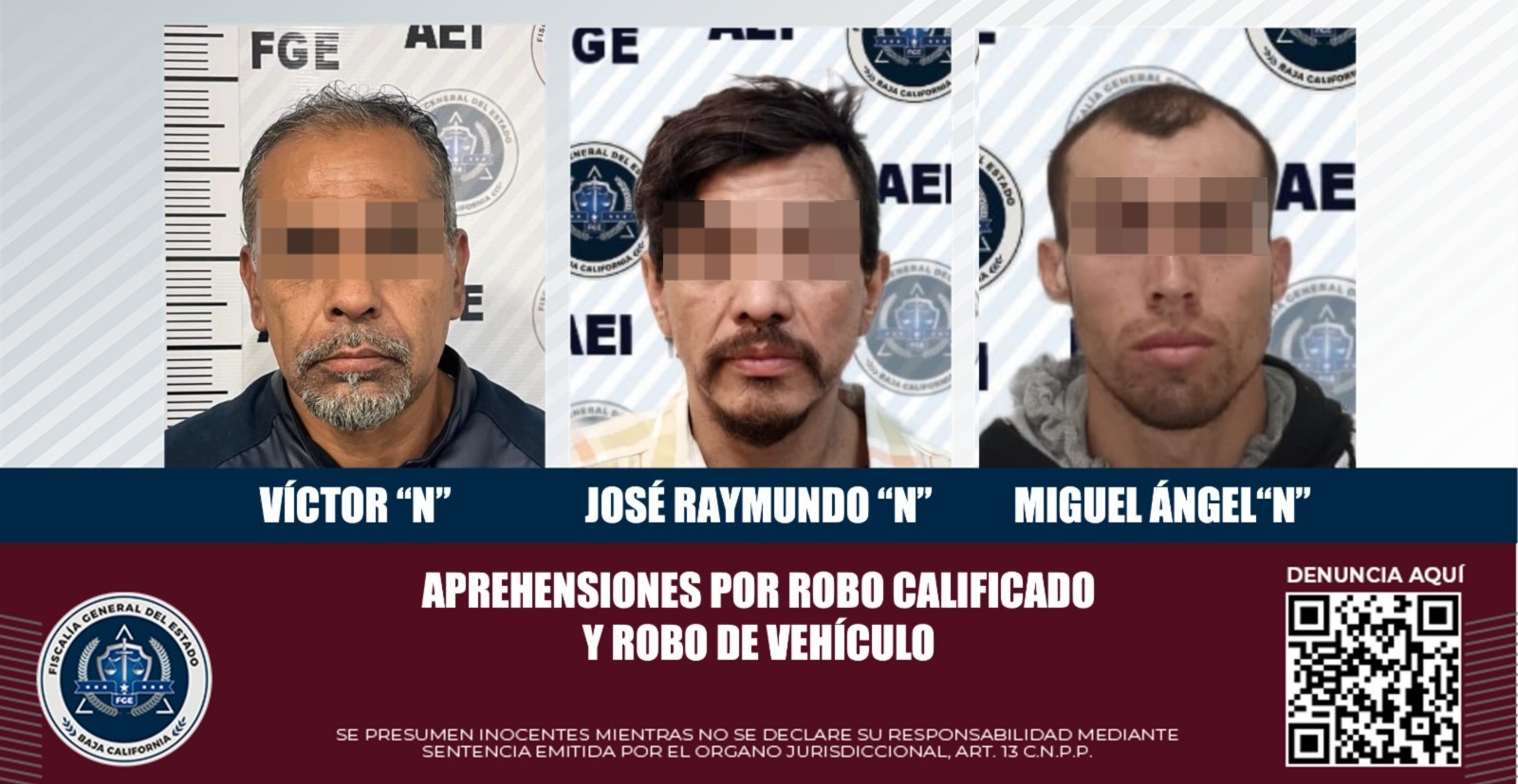 TIJUANA, BAJA CALIFORNIA. - La Fiscalía General el Estado, a través de la Unidad de Aprehensiones de la Agencia Estatal de Investigación, cumplimentó tres mandatos judiciales por los delitos de robo calificado y robo de vehículo.