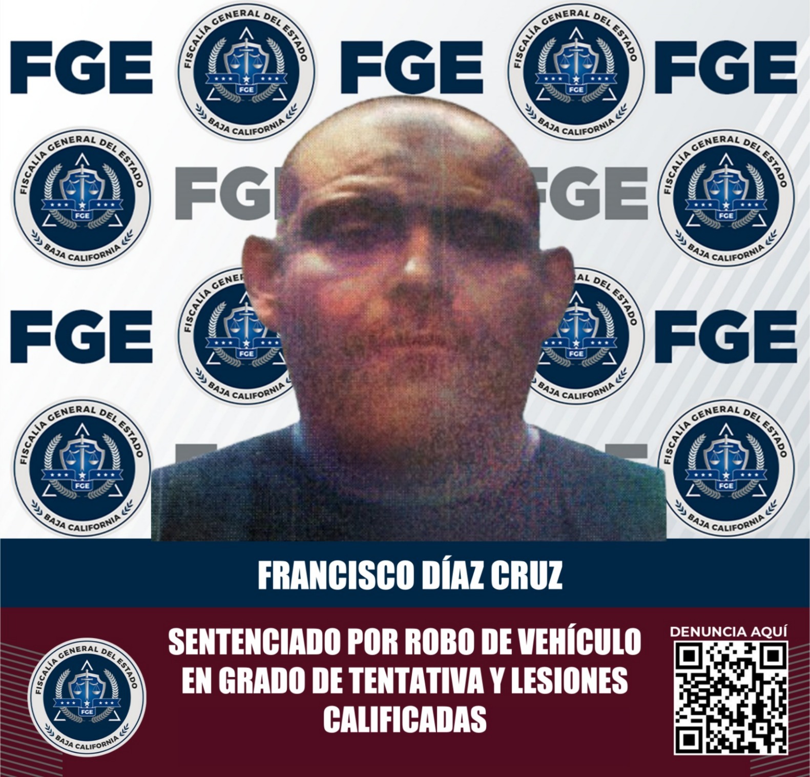 ENSENADA, BAJA CALIFORNIA. - La Fiscalía Regional de Ensenada, a través de la Unidad de Investigación de Robo de Vehículos, obtuvo una sentencia condenatoria contra Francisco Díaz Cruz, quien fue acusado de robo, robo de vehículo de motor en grado de tentativa y lesiones.