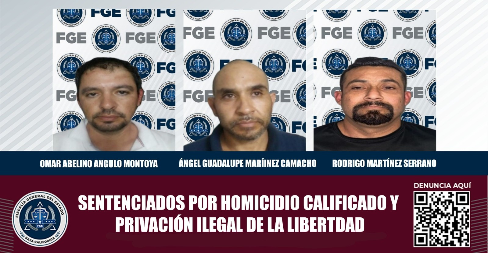 MEXICALI, BAJA CALIFORNIA. - La Fiscalía General del Estado informa que, a través de un procedimiento abreviado, se obtuvo una sentencia de 25 años 6 meses de prisión para tres sujetos, a quienes se les responsabilizó del delito de homicidio calificado por ventaja y privación ilegal de la libertad.