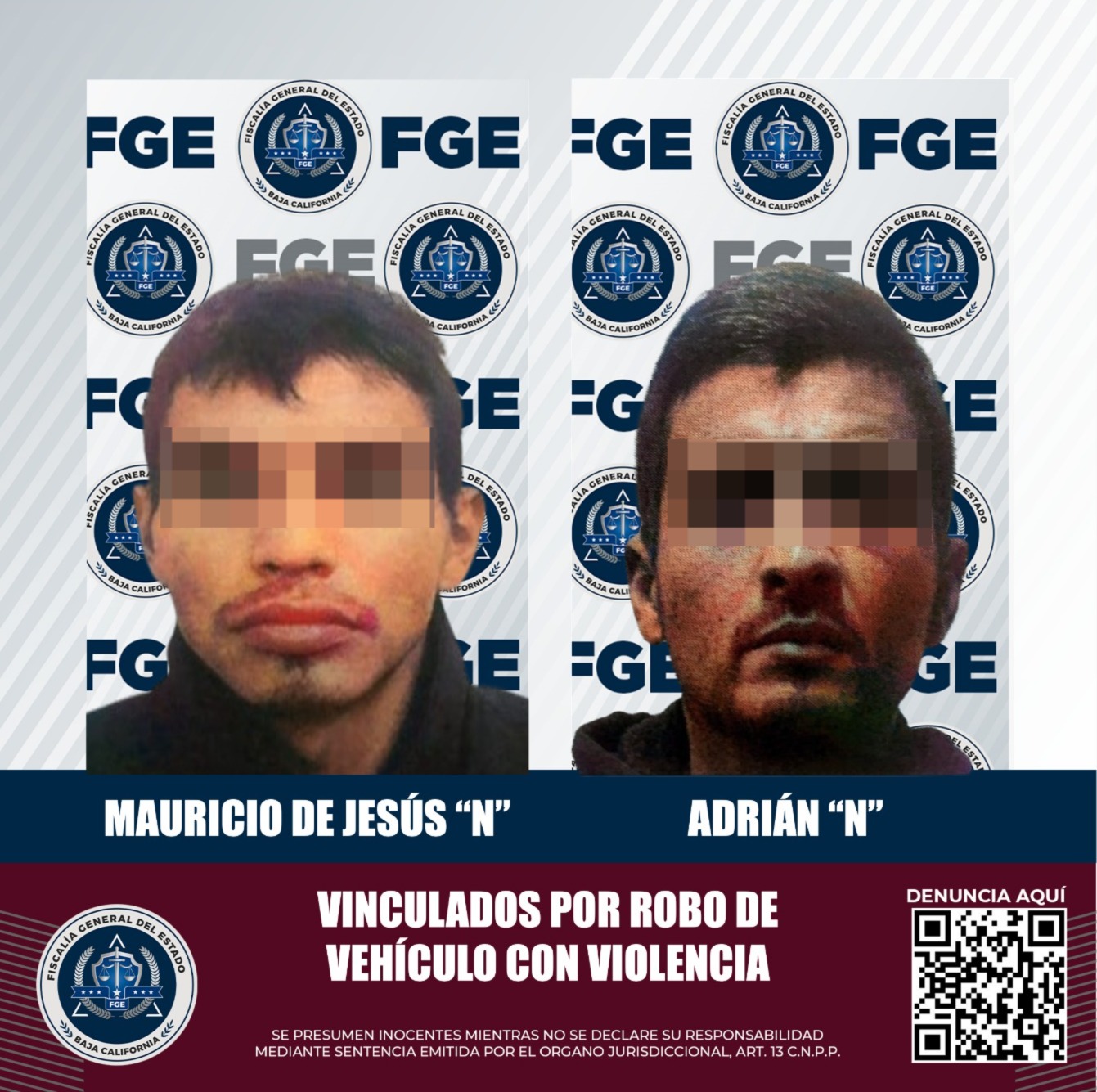 TIJUANA, BAJA CALIFORNIA. - Gracias a la labor de investigación y presentación de datos de prueba ante el Juez de Control, la Fiscalía Regional de Tijuana, informa que se obtuvo la vinculación a proceso de dos masculinos acusados del delito de robo de vehículo ejecutado con violencia y lesiones, en un hecho ocurrido el día 20 de noviembre de este año.
