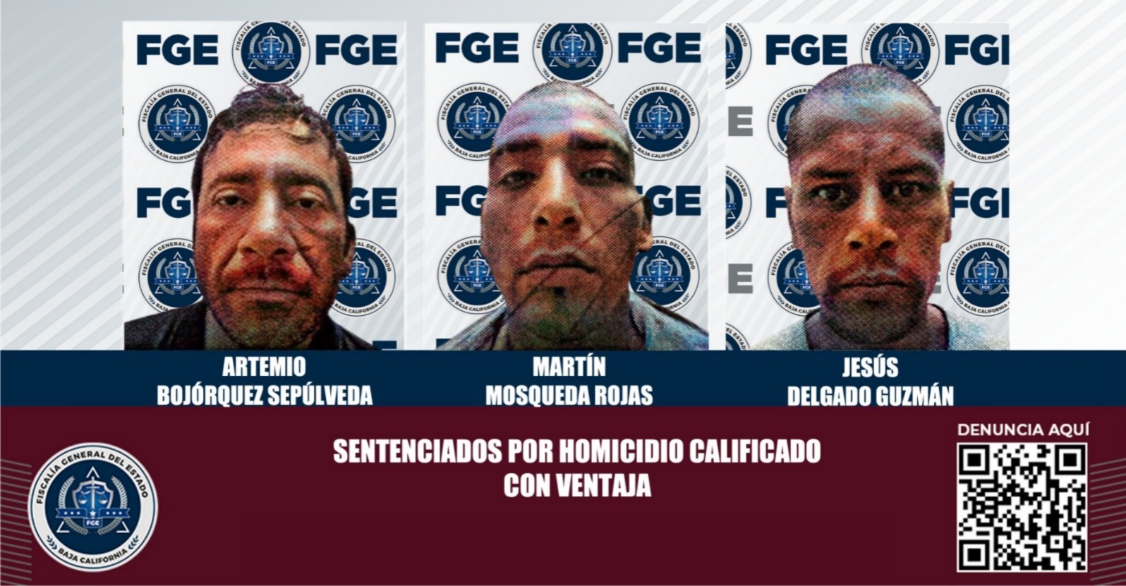 TIJUANA, BAJA CALIFORNIA. - Una rigurosa investigación llevada a cabo por la Fiscalía General del Estado resultó en la condena de 20 años de prisión para tres responsables de homicidio calificado con ventaja: Artemio Bojórquez Sepúlveda, alias “El Pariente”; Martín Mosqueda Rojas, alias “El Garufa”; y Jesús Delgado Guzmán.