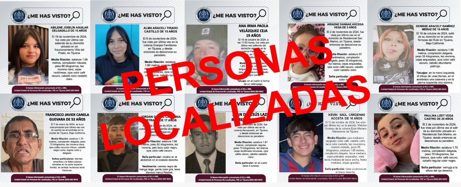 TIJUANA, BAJA CALIFORNIA. - El personal de la Fiscalía General del Estado localizó a diez personas que habían sido reportadas como desaparecidas. Entre ellas se encuentran seis mujeres y cuatro hombres, quienes fueron encontrados con buen estado de salud.