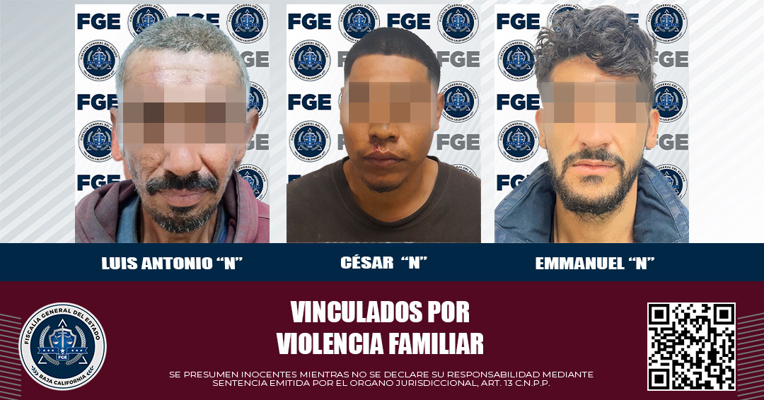 MEXICALI, BAJA CALIFORNIA. - Por presuntamente ejercer actos de violencia en contra de integrantes de su familia, tres hombres fueron vinculados a proceso con base en los elementos probatorios presentados por la Fiscalía Regional de Mexicali, a través de la Unidad de Investigación.