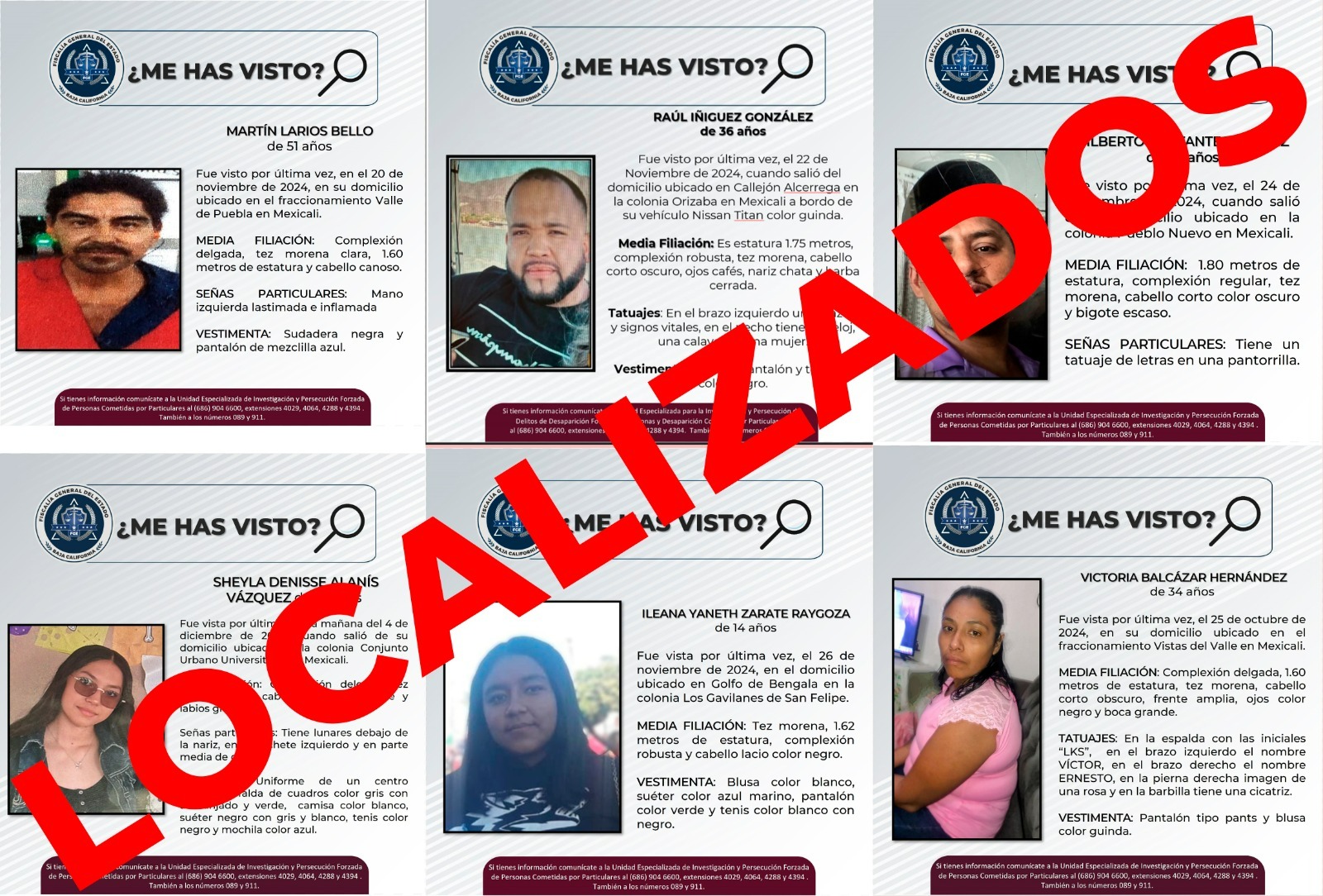 Por lo anterior, se cancelan las pesquisas generadas para la localización de Sheyla Denisse Alanís Vázquez de 15 años, Martin Larios Bello de 51; Gilberto Cervantes Chávez de 44; Victoria Balcázar Hernández de 34; Ileana Yaneth Zarate Raygoza de 14 y Raúl Iñiguez González de 36 años.