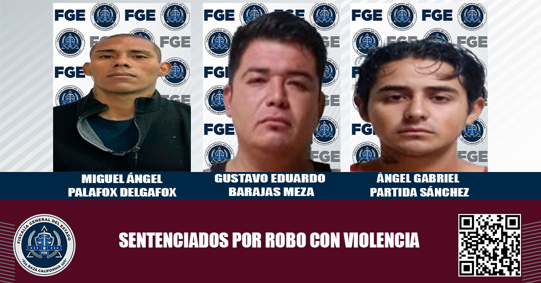 MEXICALI, BAJA CALIFORNIA. - Derivado de la presentación de pruebas y argumentos sólidos la Fiscalía General del Estado, obtuvo sentencias condenatorias en contra de tres hombres a quien se les encontró culpables del delito de robo con violencia.