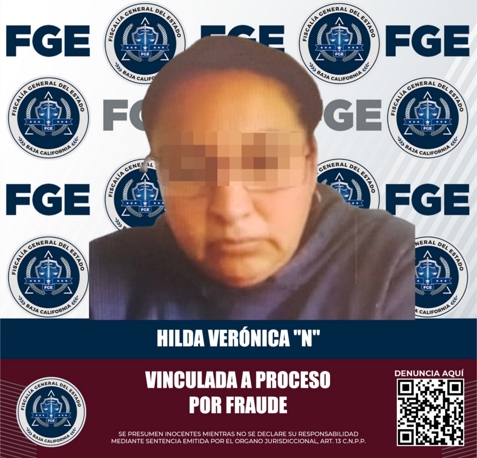 TECATE, BAJA CALIFORNIA. - La Fiscalía General del Estado informa que, tras la presentación de pruebas por parte del Ministerio Público, el Juez de Control determinó vincular a proceso a una mujer por el delito de fraude.