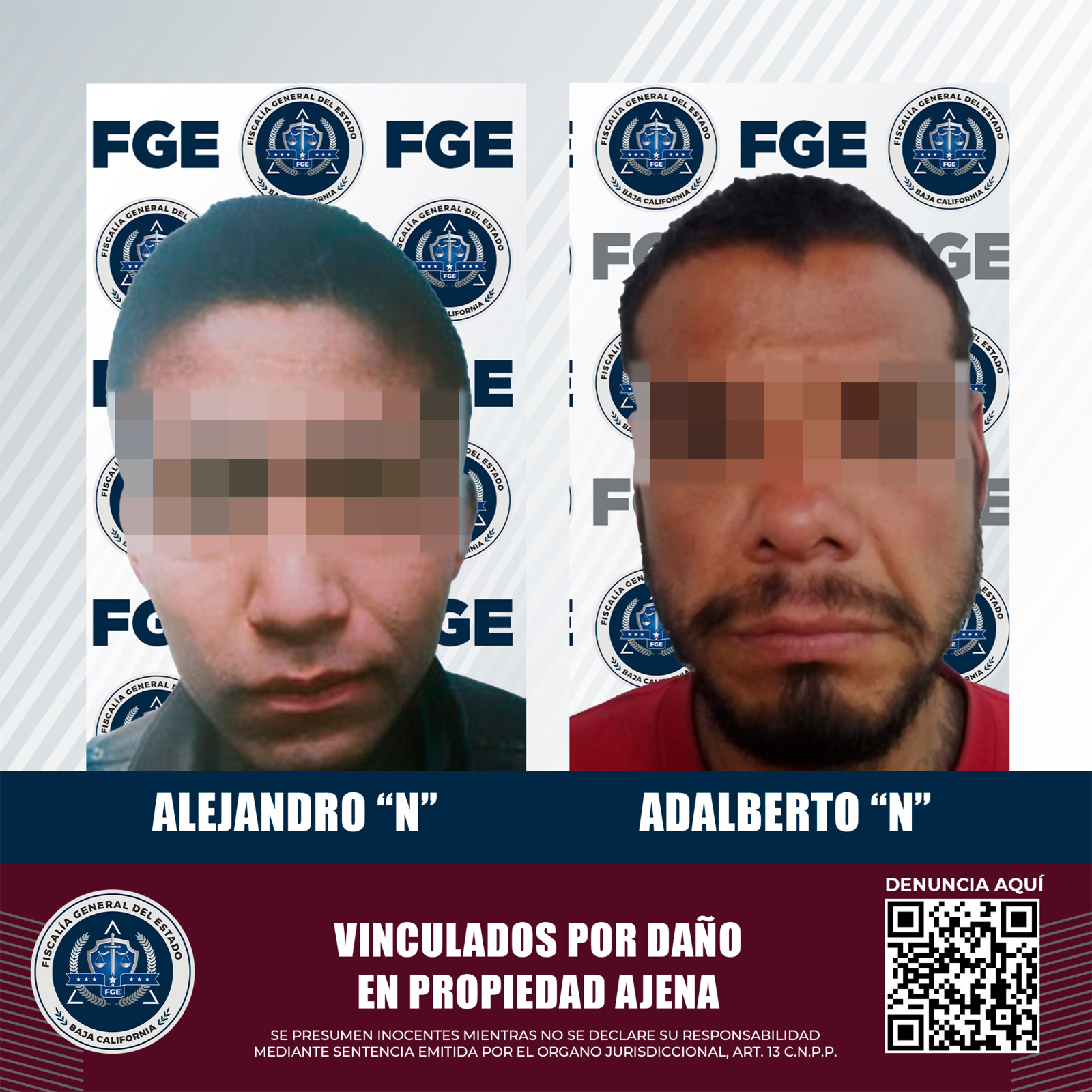 MEXICALI, BAJA CALIFORNIA. - La Fiscalía Regional de Mexicali, a través de las Unidades de Investigación con Detenido Oriente y Foránea de Ciudad Morelos, obtuvo en audiencias por separado la vinculación a proceso de dos individuos acusados de daño en propiedad ajena.