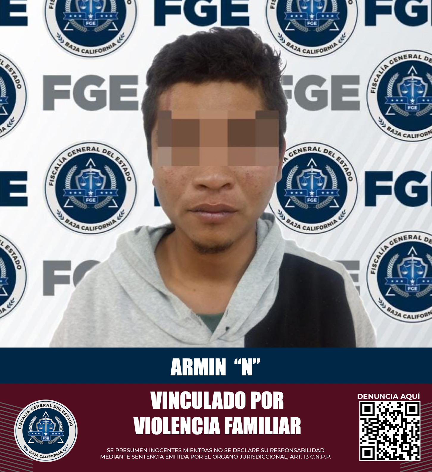 SAN QUINTÍN, BAJA CALIFORNIA. - La Fiscalía Regional de San Quintín logró la medida cautelar de prisión preventiva justificada contra Armin "N", quien ha sido vinculado a proceso por el delito de violencia familiar.