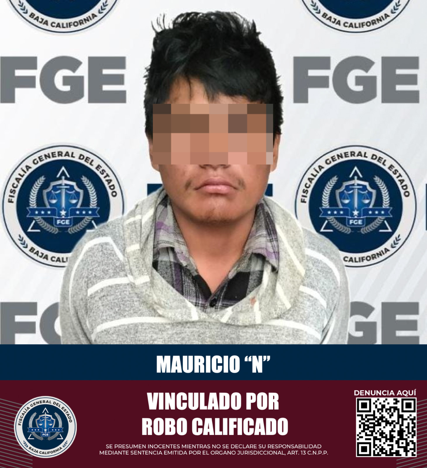 SAN QUINTÍN, BAJA CALIFORNIA. - La Fiscalía Regional de San Quintín logró la imposición de la medida cautelar de prisión preventiva contra Mauricio “N”, quien fue capturado en flagrancia tras presuntamente cometer un robo en una tienda de conveniencia. El detenido ha sido vinculado a proceso por el delito de robo calificado a establecimiento comercial.