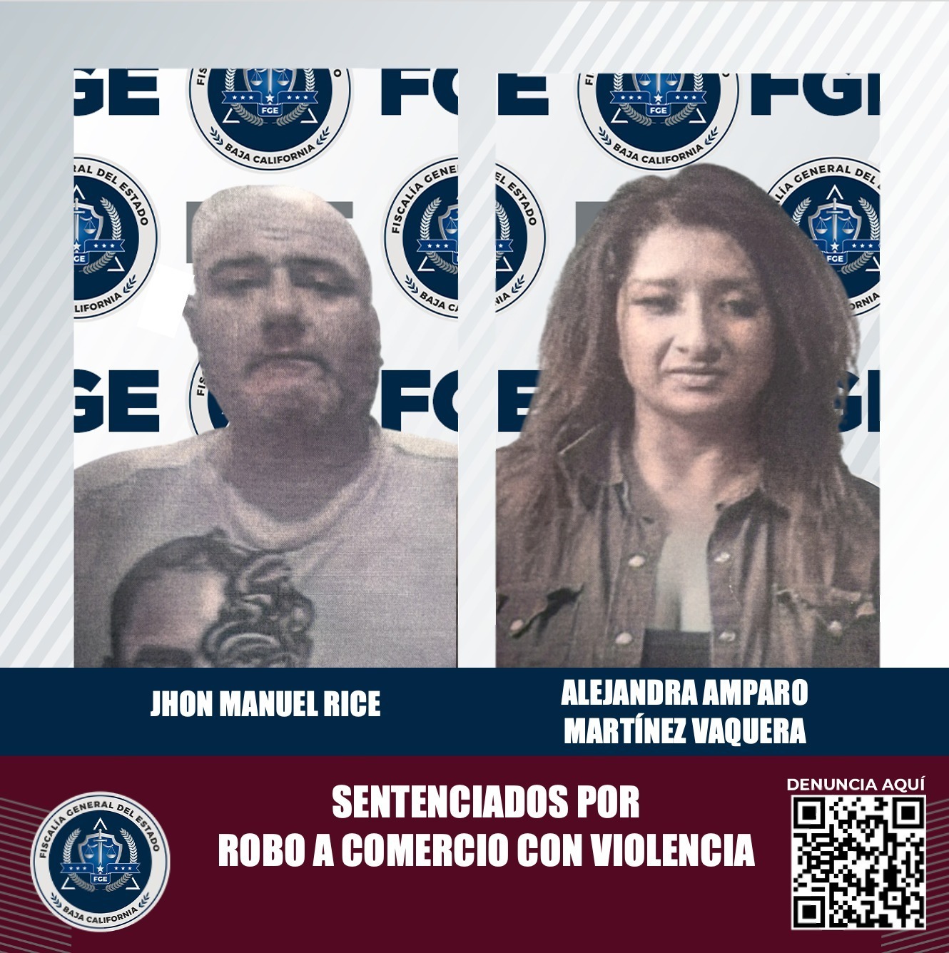 TIJUANA, BAJA CALIFORNIA. - La Fiscalía General del Estado, a través de la Unidad de Investigación de Robos La Mesa, logró que los imputados Jhon Manuel Rice y Alejandra Amparo Martínez Vaquera fueran condenados mediante un procedimiento abreviado por el delito de robo calificado a comercio abierto al público ejecutado con violencia.
